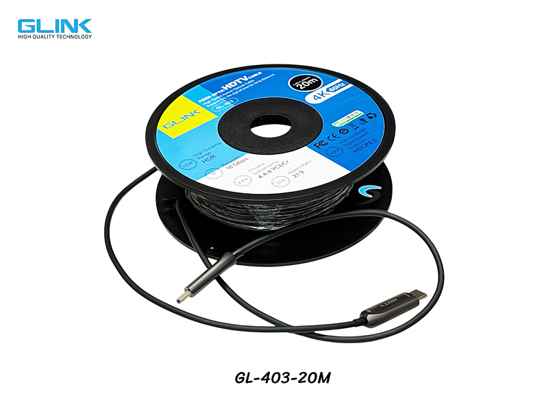 สาย HDMI Fiber Optic แบรนด์ GLINK รุ่น GL-403-20 ความยาว 20 เมตร คือสาย HDMI ที่ใช้สัญญาณแสงเป็นตัวนำ หรือสายไฟเบอร์ออฟติกซึ่งข้อดีของสายชนิดนี้จะมีค่าการสูญเสียสัญญาณต่ำมาก เพราะใช้แสงเป็นตัวนำและสามารถเชื่อมต่อสัญญาณจากอุปกรณ์ถึงจอแสดงผลได้ไกลกว่าสายแบบทองแดงทั่วไป การใช้งานของสายประเภทนี้ต้องเสียบให้ถูกฝั่งเท่านั้นถึงจะใช้งานได้ โดยที่หัวสายจะระบุฝั่งให้ชัดเจนโดยฝั่งอุปกรณ์ต้นทางจะระบุข้อความ Source และปลายทางจะระบุข้อความ Display เป็นตัวหนังสือใว้ให้ เนื่องจากภายในหัวสายจะมีโมดูลแสงฝังไว้ ตัวสายรองสัญญาณ 4K@60Hz 4:4:4 เต็มรูปแบบ