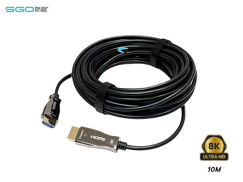 สาย HDMI ไฟเบอร์ออฟติก SGO 8K@60Hz เวอร์ชั่น 2.1 ความยาว 10 เมตร คือสาย HDMI ที่ใช้สัญญาณแสงเป็นตัวนำ ซึ่งข้อดีของสายชนิดนี้จะมีค่าการสูญเสียสัญญาณต่ำมาก เพราะใช้แสงเป็นตัวนำและสามารถเชื่อมต่อสัญญาณจากอุปกรณ์ถึงจอแสดงผลได้ไกลกว่าสายแบบทองแดงทั่วไป การใช้งานของสายประเภทนี้ต้องเสียบให้ถูกฝั่งเท่านั้นถึงจะใช้งานได้ โดยที่หัวสายจะระบุฝั่งให้ชัดเจนโดยฝั่งอุปกรณ์ต้นทางจะระบุข้อความ Source และปลายทางจะระบุข้อความ Display เป็นตัวหนังสือใว้ให้ตัวสายรองรับสัญญาณ 4K@120Hz, 8K@60Hz หรือ 4K @120 เฟรมต่อวินาที และ 8K @60 เฟรมต่อวินาที เหมาะสุดสำหรับทีวีแบบ QLED และ PS5