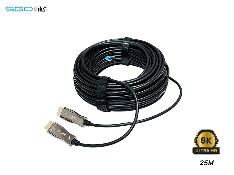 สาย HDMI ไฟเบอร์ออฟติก SGO 8K@60Hz เวอร์ชั่น 2.1 ความยาว 25 เมตร คือสาย HDMI ที่ใช้สัญญาณแสงเป็นตัวนำ ซึ่งข้อดีของสายชนิดนี้จะมีค่าการสูญเสียสัญญาณต่ำมาก เพราะใช้แสงเป็นตัวนำและสามารถเชื่อมต่อสัญญาณจากอุปกรณ์ถึงจอแสดงผลได้ไกลกว่าสายแบบทองแดงทั่วไป การใช้งานของสายประเภทนี้ต้องเสียบให้ถูกฝั่งเท่านั้นถึงจะใช้งานได้ โดยที่หัวสายจะระบุฝั่งให้ชัดเจนโดยฝั่งอุปกรณ์ต้นทางจะระบุข้อความ Source และปลายทางจะระบุข้อความ Display เป็นตัวหนังสือใว้ให้ตัวสายรองรับสัญญาณ 4K@120Hz, 8K@60Hz หรือ 4K @120 เฟรมต่อวินาที และ 8K @60 เฟรมต่อวินาที เหมาะสุดสำหรับทีวีแบบ QLED และ PS5