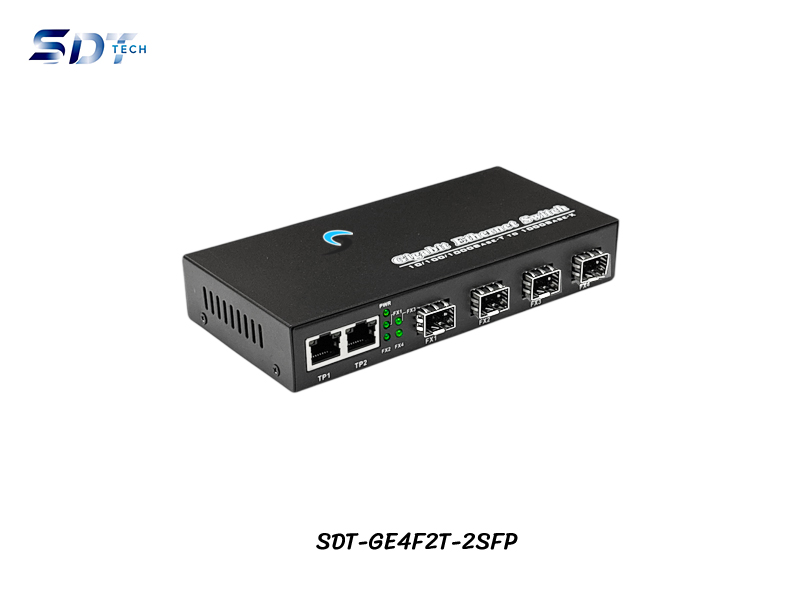 Gigabit Switch SFP 4 Port Uplink 2 Gigabit LAN แบรนด์ SDT-TECH รุ่น SDT-GE4F2T-SFP สำหรับการใช้งานที่หลากหลายมาขึ้นโดยใช้ SFP เป็นตัวกำหนด รองรับ SFP แบบ Single-mode และ Multi-mode (1.25Gbps) เหมาะกับงานเชื่อมข้อมูลผ่านสายไฟเบอร์ออฟติก ไปในหลายที่โดยใช้ต้นทางเพียงจุดเดียว ซึ่งจะทำให้การควบคุมระบบเป็นไปด้วยความง่าย ไม่ยุ่งยากซับซ้อน