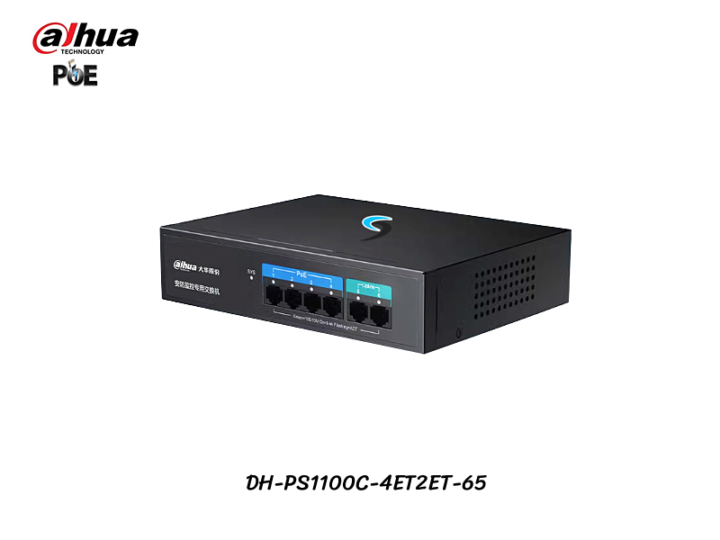 PoE Switch 4 Port 10/100 ยี่ห้อ dahua รุ่น DH-PS1100C-4ET2ET-65 มาตรฐาน IEEE802.3af/at เป็นอุปกรณ์จ่ายไฟและส่งข้อมูลไปในสายแลนเส้นเดียวพร้อมกัน รองรับการใช้งานร่วมกับกล้องวงจรปิดแบบ IP Camera ทุกยี่ห้อ รวมถึง Access Point และอุปกรณ์อื่นๆ ที่รองรับ PoE ในตัว ระยะในการจ่ายไฟผ่านสายแลน 150 เมตร ทั้ง 4 Port