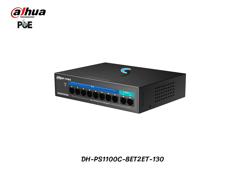 PoE Switch 8 Port 10/100 ยี่ห้อ Dahua รุ่น DH-PS1100C-8ET2ET-130 มาตรฐาน IEEE802.3af/at เป็นอุปกรณ์จ่ายไฟและส่งข้อมูลไปในสายแลนเส้นเดียวพร้อมกัน รองรับการใช้งานร่วมกับกล้องวงจรปิดแบบ IP Camera ทุกยี่ห้อ รวมถึง Access Point และอุปกรณ์อื่นๆ ที่รองรับ PoE ในตัว ระยะในการจ่ายไฟผ่านสายแลน 150 เมตร ทั้ง 8 Port