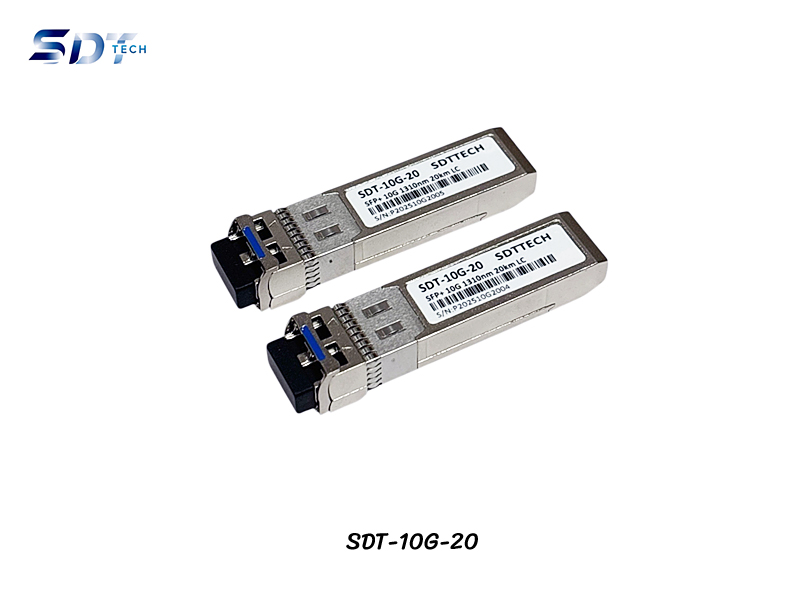 SFP+ SM LC Duplex DDM 20KM แบรนด์ SDT-TECH รุ่น SDT-10G-20 รองรับความเร็ว 10 Gigabit หรือ 10000Mbps หัวเชื่อมต่อไฟเบอร์ออฟติกแบบ LC รองรับสายไฟเบอร์ออฟติกชนิด Single-Mode ระยะรับส่งข้อมูลสูงสุด 20 กิโลเมตร ใช้งานได้กับอุปกรณ์สวิตซ์ Cisco, Linksys, TP-Link, D-Link, Link, Huawei, ZTE, NETGEAR, DELL, BTI, DCN, RUISIE และแบรนด์อื่นๆ ติดตั้งง่ายไม่ต้องตั้งค่าใดๆ