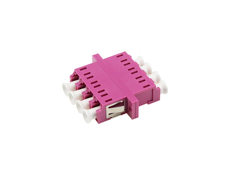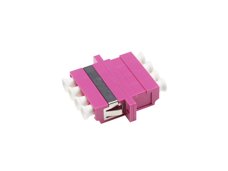 ตัวต่อหัวไฟเบอร์ LC-LC (UPC) Quad OM4 Multi-mode ตัวต่อสำหรับยึดในกล่องพักสายไฟเบอร์ออฟติก ระหว่างหัวไฟเบอร์ออฟติกสำหรับหัวไฟเบอร์ชนิด LC Multi Mode OM4 (สีไวโอเล็ต) กรณีต่อกลางสาย 4 เส้น หรือต่อกับสาย Patch Cord ก่อนเข้าอุปกรณ์เช่น Media Converter, เร้าเตอร์ FTTH และใช้ยึดเข้ากับ Snap in Plate เป็นต้น