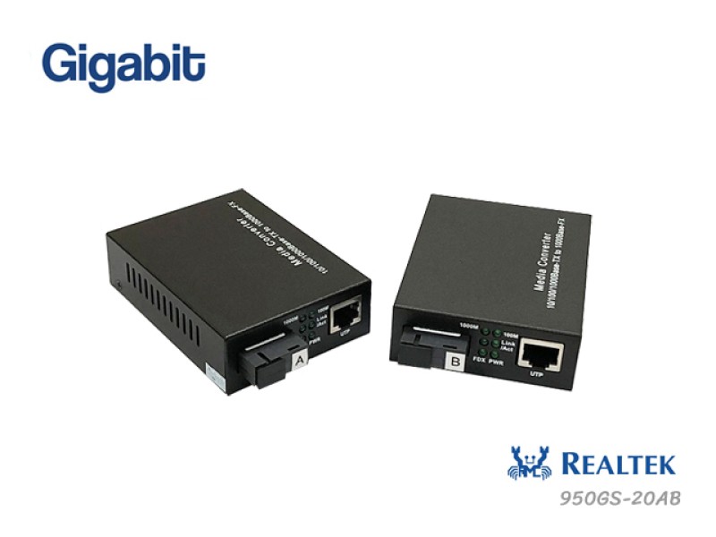 Gigabit Fiber Media Converter WDM 1310/1550nm รุ่น 950GS-20AB (R) ใช้แผงวงจรแบบเต็มไม่ลดอุปกรณ์ในวงจรลงเหมือนรุ่นทั่วไปที่ใช้แผงวงจรแบบครึ่งแผ่น ทำให้มีความเสถียรสูงกว่าและใช้ ชิพเซท Realtek สำหรับงานด้านเครือข่ายอินเตอร์เน็ต และงานด้านอื่นๆที่ใช้รูปแบบการเชื่อมต่อข้อมูลแบบ TCP รองรับการใช้งานร่วมกับสายไฟเบอร์ออฟติก 1 Core ชนิด Single Mode ในระยะ 0-20 กิโลเมตร