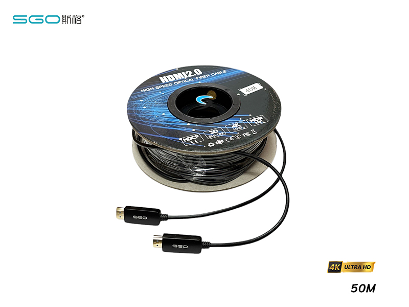 สาย HDMI ไฟเบอร์ออฟติก SGO 4K@60Hz เวอร์ชั่น 2.0 ความยาว 50 เมตร สำหรับการส่งสัญญาณภาพ 60 เฟรม ต่อวินาที ใช้สัญญาณแสงหรือสายไฟเบอร์ออฟติกเป็นตัวนำสัญญาณ ซึ่งข้อดีของสายชนิดนี้จะมีค่าการสูญเสียสัญญาณต่ำมาก เพราะใช้แสงเป็นตัวนำและสามารถเชื่อมต่อสัญญาณจากอุปกรณ์ถึงจอแสดงผลได้ไกลกว่าสายแบบทองแดงทั่วไป การใช้งานของสายประเภทนี้ต้องเสียบให้ถูกฝั่งเท่านั้นถึงจะใช้งานได้ โดยที่หัวสายจะระบุฝั่งให้ชัดเจนโดยฝั่งอุปกรณ์ต้นทางจะระบุข้อความ Source และปลายทางจะระบุข้อความ Display เป็นตัวหนังสือใว้ให้ เนื่องจากภายในหัวสายจะมีโมดูลแสงฝังไว้ ตัวสายรองสัญญาณ 4K@60Hz 4:4:4 เต็มรูปแบบ