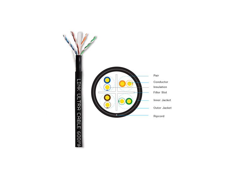 สายแลนภายนอก Cat6 100 เมตร ยี่ห้อ LINK รุ่น US-9106OUT-1 วัสดุเปลือกหุ้มสายใช้วัสดุ PE ในชั้นแรก และ FRPVC ในชั้นที่ 2 (Double Jacket) ขนาดสายทองแดง 23AWG หรือ 0.58 มิลลิเมตร ความต้านทานสาย 1-600 MHz รองรับการใช้งานระบบเครือข่ายอินเตอร์เน็ต (Network) หรือการใช้งานร่วมกับระบบกล้องวงจรปิด (cctv) เช่นการใช้ร่วมกับบาลัน หรือ ใช้งานร่วมกับกล้อง IP-Camera โดยใช้ร่วมกับ POE Switch สายแลน Cat6 เป็นสายที่รองรับความเร็วในระดับ Gigabit ได้เต็มระยะ 100 เมตร และความเร็ว 10 Gigabit ที่ระยะ 55 เมตร