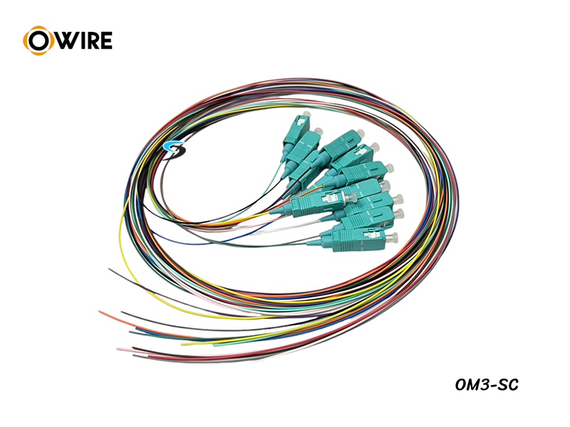 Pigtail Fiber Optic SC/UPC Multi Mode OM3 (50/125μm) เป็นสาย 12 Core จัดเรียงชุดสีตามมาตรฐาน TIA-598-A สำหรับใช้เชื่อมต่อเข้าจุดพักสายจากสายเมนหลัก รองรับการเชื่อมต่อเข้ากับสายมัลติโหมดทุกชนิด ขนาดคอร์ไฟเบอร์อยู่ที่ 50/125μm เข้ากันได้กับสายแบบ OM1 (62.5/125μm) เนื่องจากขนาดคอร์ไฟเบอร์มีความแตกต่างกันเล็กน้อย