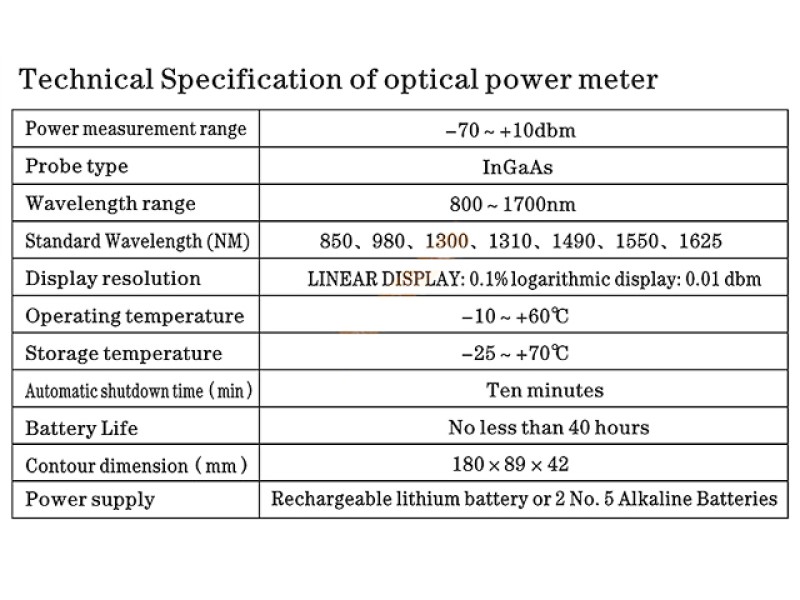 Optical Power Meter เป็นอุปกรณ์สำหรับวัดความแรงของสัญญาณแสงที่ปล่อยมาจากต้นทาง หลังจากที่ทำการเข้าหัวไฟเบอร์ออฟติก ตัวเครื่องจะแสดงหน่วยวัดค่าออกมาเป็น dBm Scope (-70)-(+10) dBm การวัดค่าแสงดังกล่าว ก่อนการวัดต้องปรับค่าของเครื่องให้ตรงกับค่าแสงจากต้นทางที่ปล่อยมา เช่น 850nm, 1300nm, 1310nm, 1490nm, 1550nm เป็นต้น ส่วนค่าที่ได้นั้น ผู้ใช้ต้องทราบถึงปัจจัยหลายอย่างที่เข้ามามีส่วนร่วมในระบบสายเส้นนั้นๆ เช่นระยะสายไฟเบอร์ออฟติก รอยเชื่อมต่อต่างๆ ซึ่งสาเหตุเหล่านี้จะเพิ่มค่าลดทอนเข้าไปอีก เพราะฉะนั้นลูกค้าต้องศึกษาคำนวนเรื่องการลดทอนต่างๆเข้าไปด้วย ถึงจะได้ค่าที่มีความใกล้เคียงที่สุด