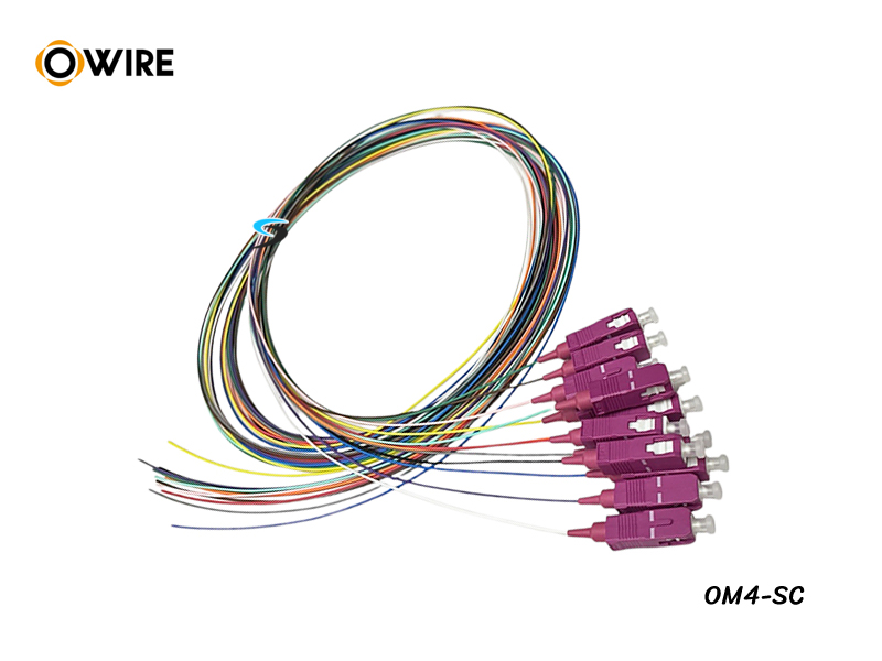 Pigtail Fiber Optic SC/UPC Multi Mode OM4 (50/125μm) จัดเรียงชุดสีตามมาตรฐาน TIA-598-A เป็นสาย 12 Core สำหรับใช้เชื่อมต่อเข้าจุดพักสายจากสายเมนหลัก รองรับการเชื่อมต่อเข้ากับสายมัลติโหมดทุกชนิด ขนาดคอร์ไฟเบอร์อยู่ที่ 50/125μm เข้ากันได้กับสายแบบ OM1 (62.5/125μm) เนื่องจากขนาดคอร์ไฟเบอร์มีความแตกต่างกันเล็กน้อย