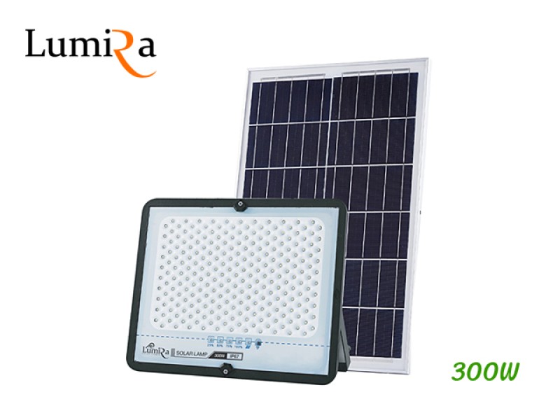โคมไฟสปอร์ตไลท์ Solar Spotlight LumiRa รุ่น LSC-028 300W เป็นโคมไฟโซล่าเซลในรูปแบบสปอตไลท์ส่องสว่าง 6500K สำหรับพื้นที่เฉพาะจุด เช่น หน้าปรตูบ้าน โรงจอดรถ หรือมุมอับมุมมึดของบ้าน โดยใช้พลังงานแสงอาทิตย์เป็นตัวชาร์จไฟเข้าไปกักเก็บพลังงานใว้ในแบตเตอรี่ Lithuim ในช่วงเวลากลางวันด้วยแผงโซล่าเซลล์ ขนาด 35cmx58cm ชั่วโมงการใช้งานในช่วงกลางคืนอยู่ระหว่าง 9-12 ซั่วโมงโดยค่าเฉลี่ย หากโคมชาร์จได้เต็มที่ ชั่วโมงการใช้งานจะเกิน 15 ชั่วโมงขึ้นอยู่กับการปรับใช้งานร่วมด้วย มีรีโมทควบคุมการใช้งานฟังค์ชั่นของโคม การติดตั้งไม่ยุ่งยากเพียงแค่หาตำแหน่งยึดโคมตามต้องการ และหาตำแหน่งยึดแผงให้อยู่ในตำแหน่งรับแสงได้เต็มที่จะดีที่สุด สามารถใช้งานในรูปแบบ Outdoor ได้มาตรฐานกันน้ำ IP67