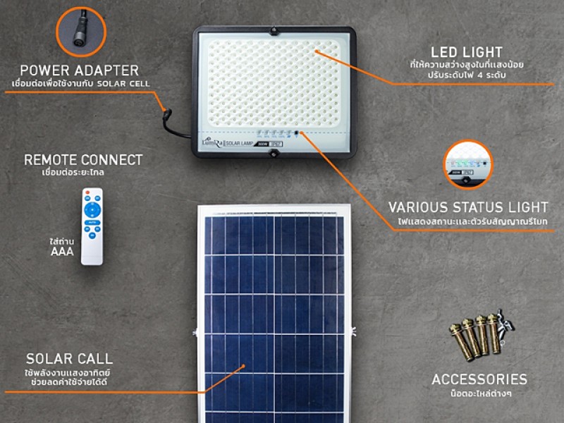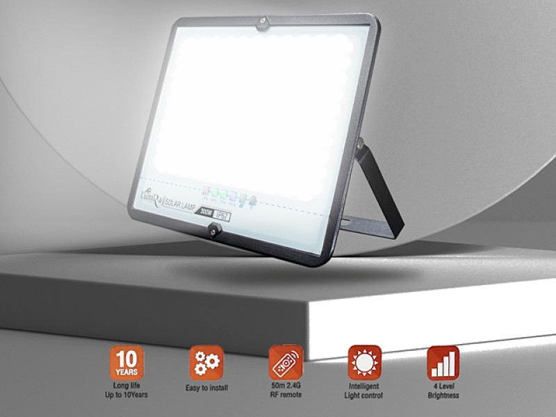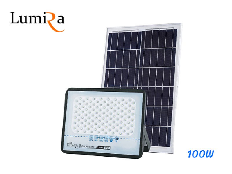 โคมไฟสปอร์ตไลท์ Solar Spotlight LumiRa รุ่น LSC-028 100W เป็นโคมไฟโซล่าเซลในรูปแบบสปอตไลท์ส่องสว่าง 6500K สำหรับพื้นที่เฉพาะจุด เช่น หน้าปรตูบ้าน โรงจอดรถ หรือมุมอับมุมมึดของบ้าน โดยใช้พลังงานแสงอาทิตย์เป็นตัวชาร์จไฟเข้าไปกักเก็บพลังงานใว้ในแบตเตอรี่ Lithuim ในช่วงเวลากลางวันด้วยแผงโซล่าเซลล์ ขนาด 35cmx40cm ชั่วโมงการใช้งานในช่วงกลางคืนอยู่ระหว่าง 9-12 ซั่วโมงโดยค่าเฉลี่ย หากโคมชาร์จได้เต็มที่ ชั่วโมงการใช้งานจะเกิน 15 ชั่วโมงขึ้นอยู่กับการปรับใช้งานร่วมด้วย มีรีโมทควบคุมการใช้งานฟังค์ชั่นของโคม การติดตั้งไม่ยุ่งยากเพียงแค่หาตำแหน่งยึดโคมตามต้องการ และหาตำแหน่งยึดแผงให้อยู่ในตำแหน่งรับแสงได้เต็มที่จะดีที่สุด สามารถใช้งานในรูปแบบ Outdoor ได้มาตรฐานกันน้ำ IP67